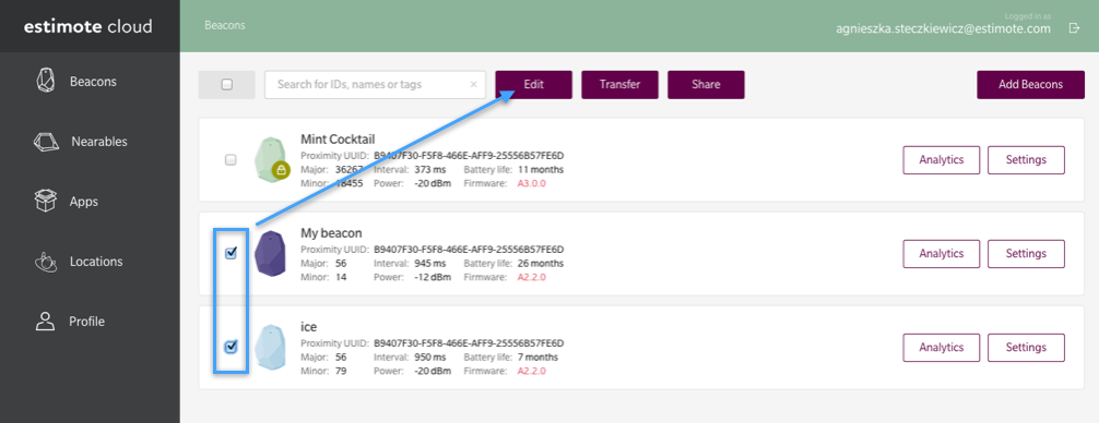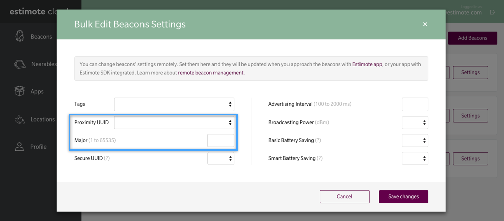 Every Estimote Beacon ships with an unique ID that you are free to modify. By default, the beacon’s ID is in iBeacon format and consists of three values: UUID, Major and Minor. Beacons broadcast their iBeacon ID, which can then be recognized by mobile apps to trigger specific actions. UUID is fixed, Major and Minor are randomized.